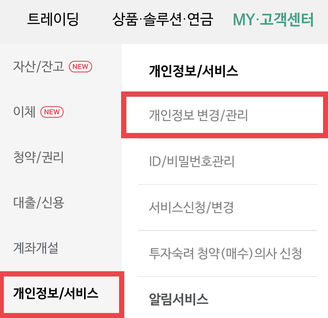 아이디나 비밀번호 관리, 서비스신청, 알림서비스 등이 나오는데 개인정보 변경/관리로 들어갑니다.